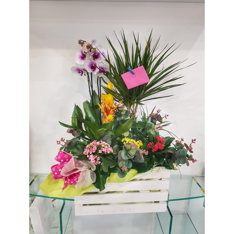 Preciosa composición formada por una variedad de plantas de alta durabilidad. Orquídeas, palmera dracena , tropical vriessia y preciosos kalanchoe hacen que la composición esté llena de color. Todas nuestras plantas son tridas semanalmente de Holanda manteniendo la frescura y duración.